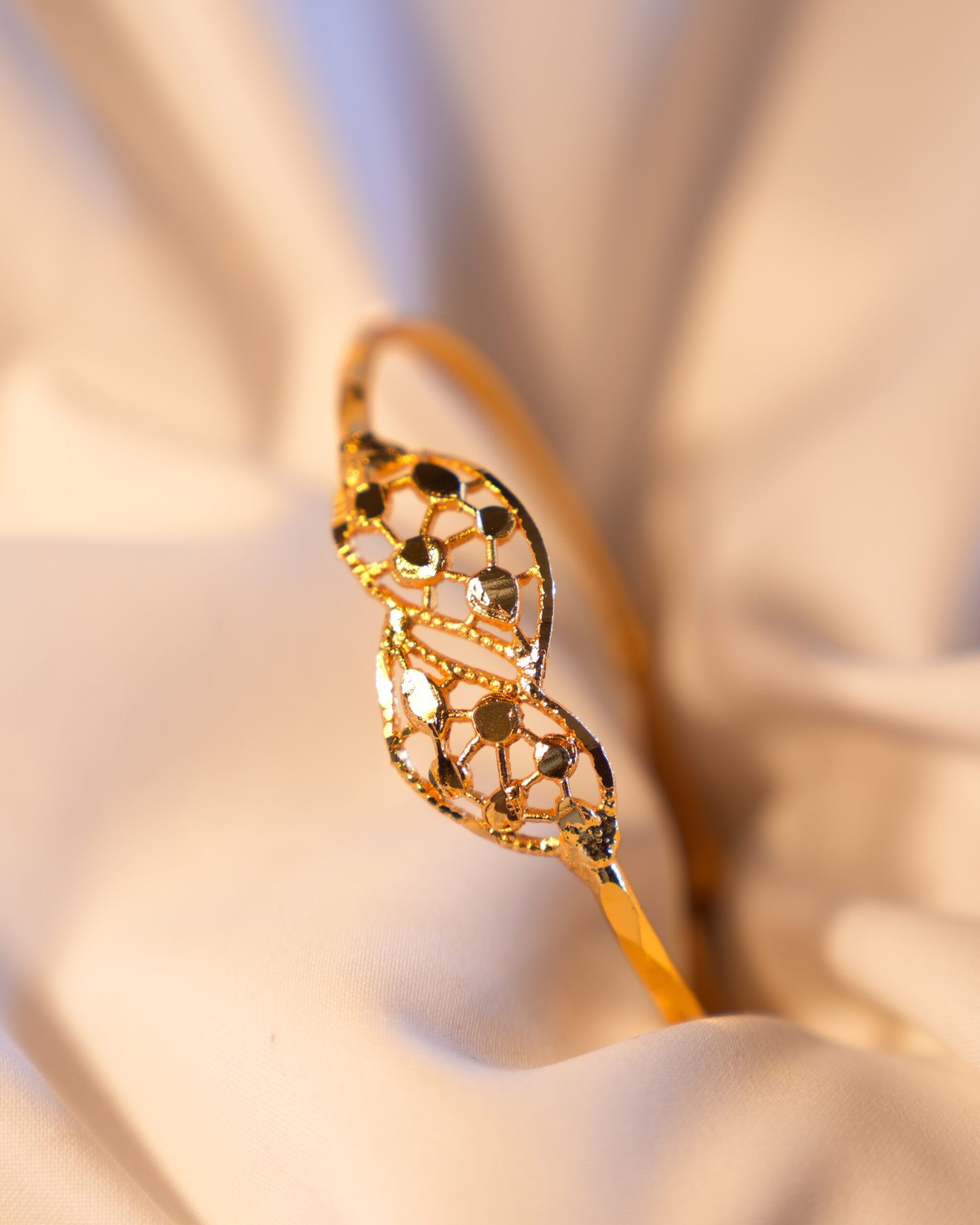 This beautiful Gold-Plated Bangle features an exquisite open-work design, perfect for adding sophisticated charm to any outfit.This exquisite piece features a striking, stylized centerpiece crafted from detailed, open-work filigree. The polished gold plating catches the light beautifully, highlighting the intricate lattice structure and adding a rich, luxurious shimmer. Elegant enough for formal events, yet stylish for daily wear.