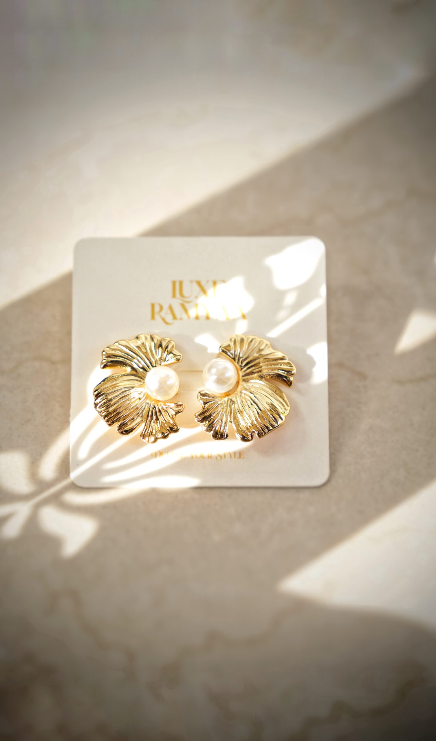 A masterpiece of coastal refinement. These earrings feature an intricate, fan-sculpted golden shell that perfectly cradles a luminous center pearl. The organic, textured gold reflects light beautifully, creating a bold yet elegant silhouette that elevates any look.