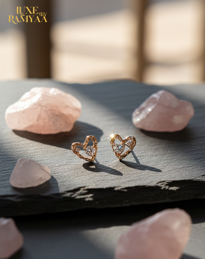 These heart-shaped studs feature a contemporary “molten” or hand-sculpted texture, offering an artisanal twist on a classic romantic symbol. Each earring is centered with a brilliant solitaire crystal that catches the light from every angle. Designed with a premium anti-tarnish finish, so you can wear your heart on your sleeve (and your ears) every single day. 💛