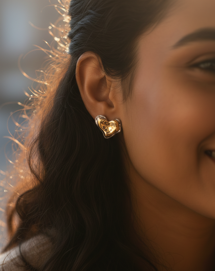 Fall in love with a modern classic. These “liquid” heart earrings feature a unique, high-shine molten texture and a sophisticated gold-and-silver contrast. Designed for the modern romantic, these studs are treated with a premium anti-tarnish finish to ensure they stay as radiant as the day you first put them on. Whether you’re dressing up a simple white tee or heading out for date night, these are your new go-to’s.