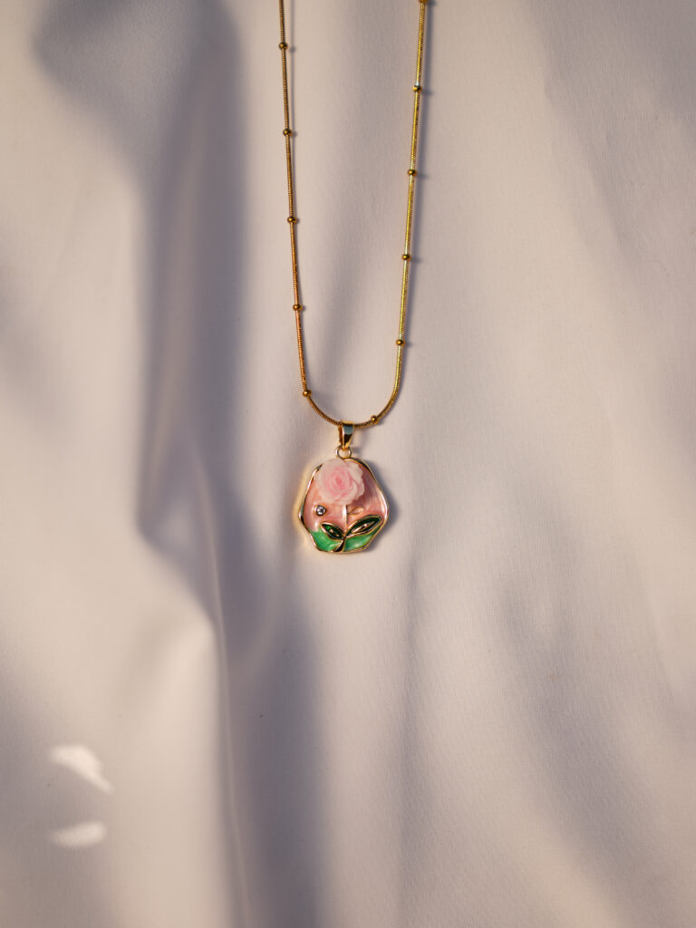 - Intricate Rose Design: The centerpiece is a beautifully crafted 3D rose in soft blush pink, set within a unique, organically shaped pendant frame.