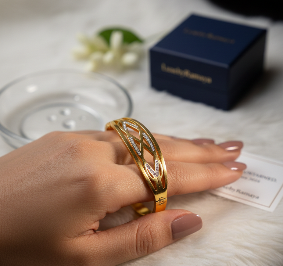 Elevate your wrist game with the Lattice Dream Bangle by LuxebyRamyaa, a piece that perfectly balances intricate, classic luxury with modern durability. This stunning bangle features an open-work lattice design, meticulously accented with pavé-set shimmering crystals to catch the light from every angle.