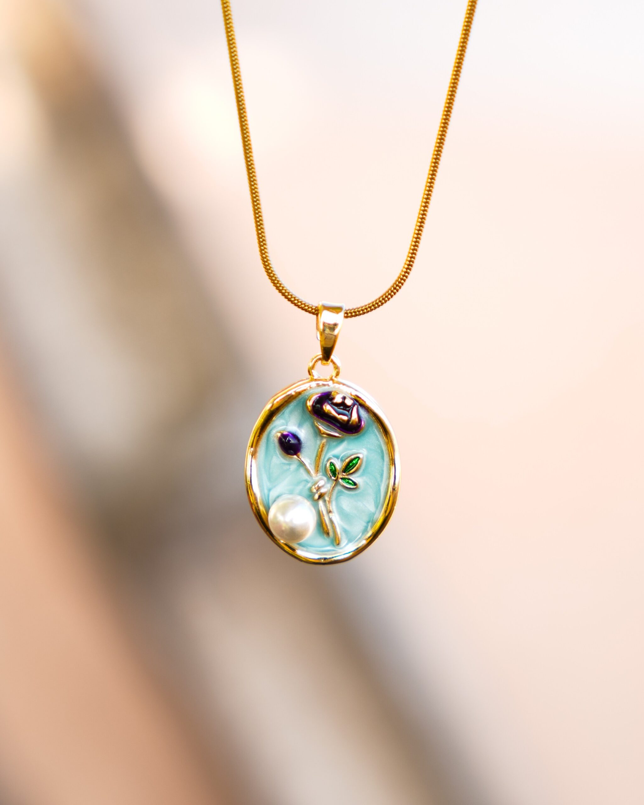 Introducing the ‘Rose Pearl’ Pendant Necklace, a stunning piece that combines modern durability with timeless elegance. This necklace is the perfect blend of luxury and practicality, designed to maintain its brilliant shine with minimal effort. The striking oval pendant features a polished ‘Rose Pearl’ background (likely a delicate pink, green or white  shell/composite material) that forms the base of the design. The pendant is gracefully suspended from a smooth, flexible gold-plated snake chain. Both the chain and the pendant setting are treated with an anti-tarnish finish, which is essential for protecting the gold luster against moisture and daily wear. This ensures the beautiful golden sheen lasts longer, making it a reliable staple piece.