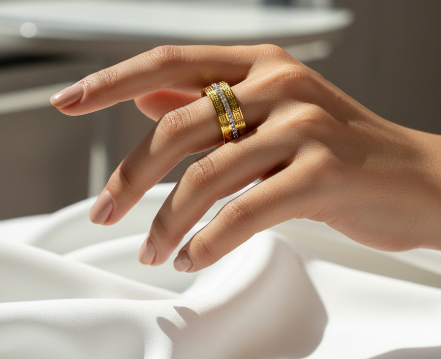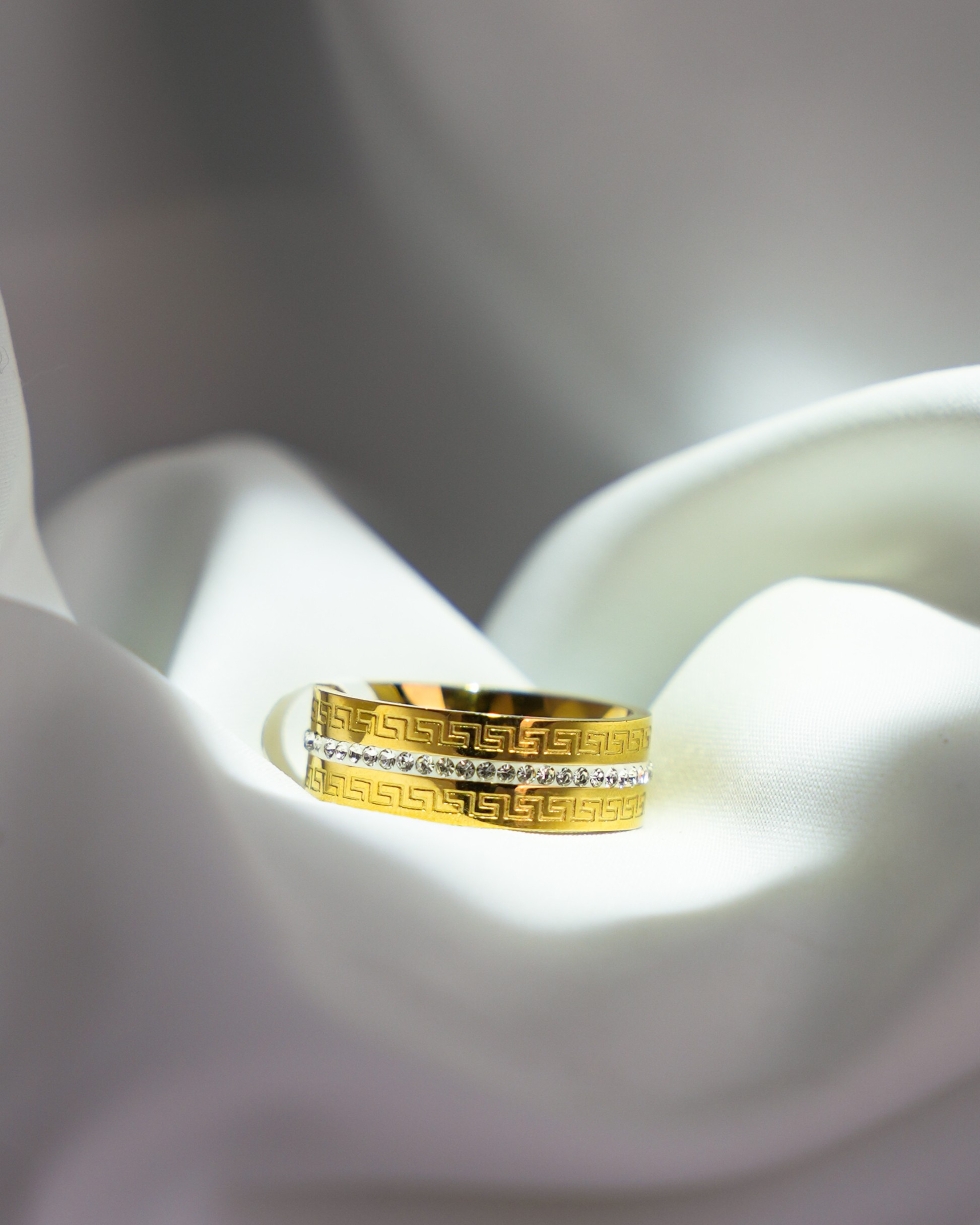 The Empire Meander Ring is a masterclass in bold, architectural design. Inspired by the eternal Meander motif of ancient Greece, this ring features intricate engravings that symbolize unity and the infinite flow of life. A precision-set channel of shimmering crystals runs through the center, adding a touch of modern brilliance to a classic silhouette.