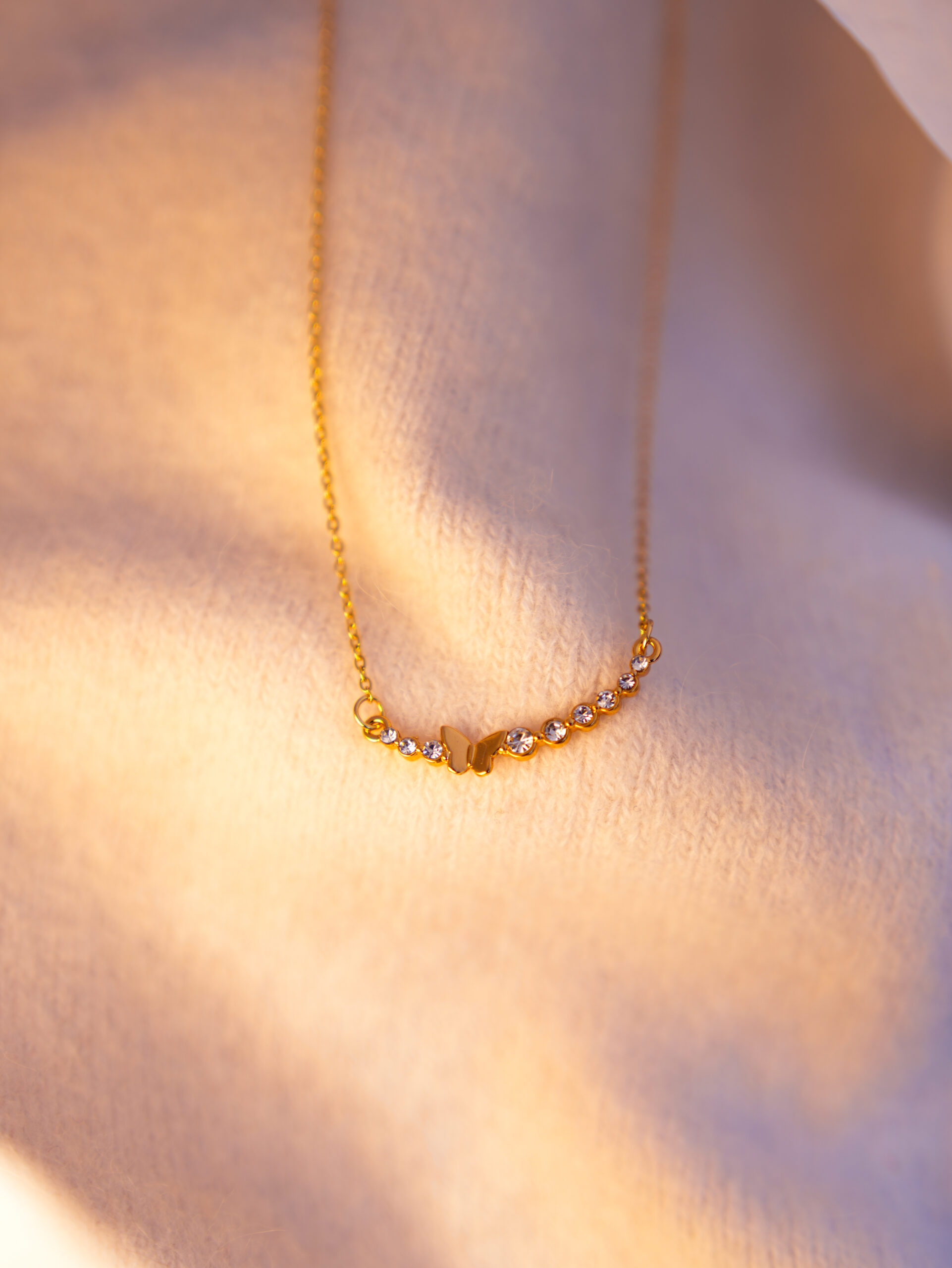 - Trending Minimalist Charm: The design features a delicate, slightly curved bar with a tiny gold butterfly at its center, surrounded by sparkling stones. This dainty, horizontal style is a staple in the current minimalist and layering jewelry trend.