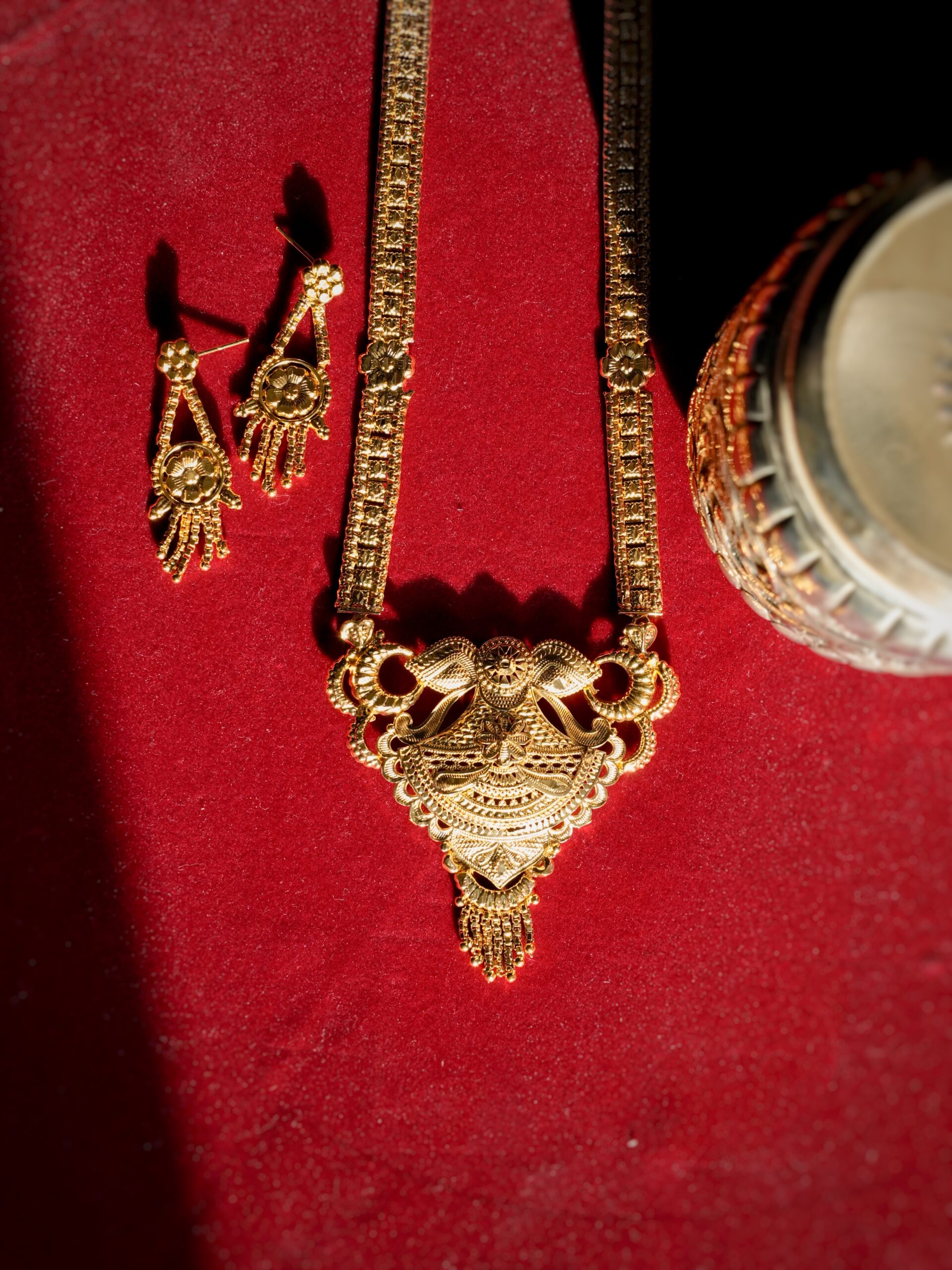 This exquisite 2-piece collection is a true work of art, designed for those who appreciate detailed traditional craftsmanship. The Long Necklace features a stunning, large pendant adorned with intricate Filigree and Gold Carvings, perfectly complemented by a bold, textured link chain. Finished with a durable Rich Gold Plating, this set offers the magnificent appearance of heavy gold jewellery, ideal for making a profound statement at your wedding, reception, or grand celebration.