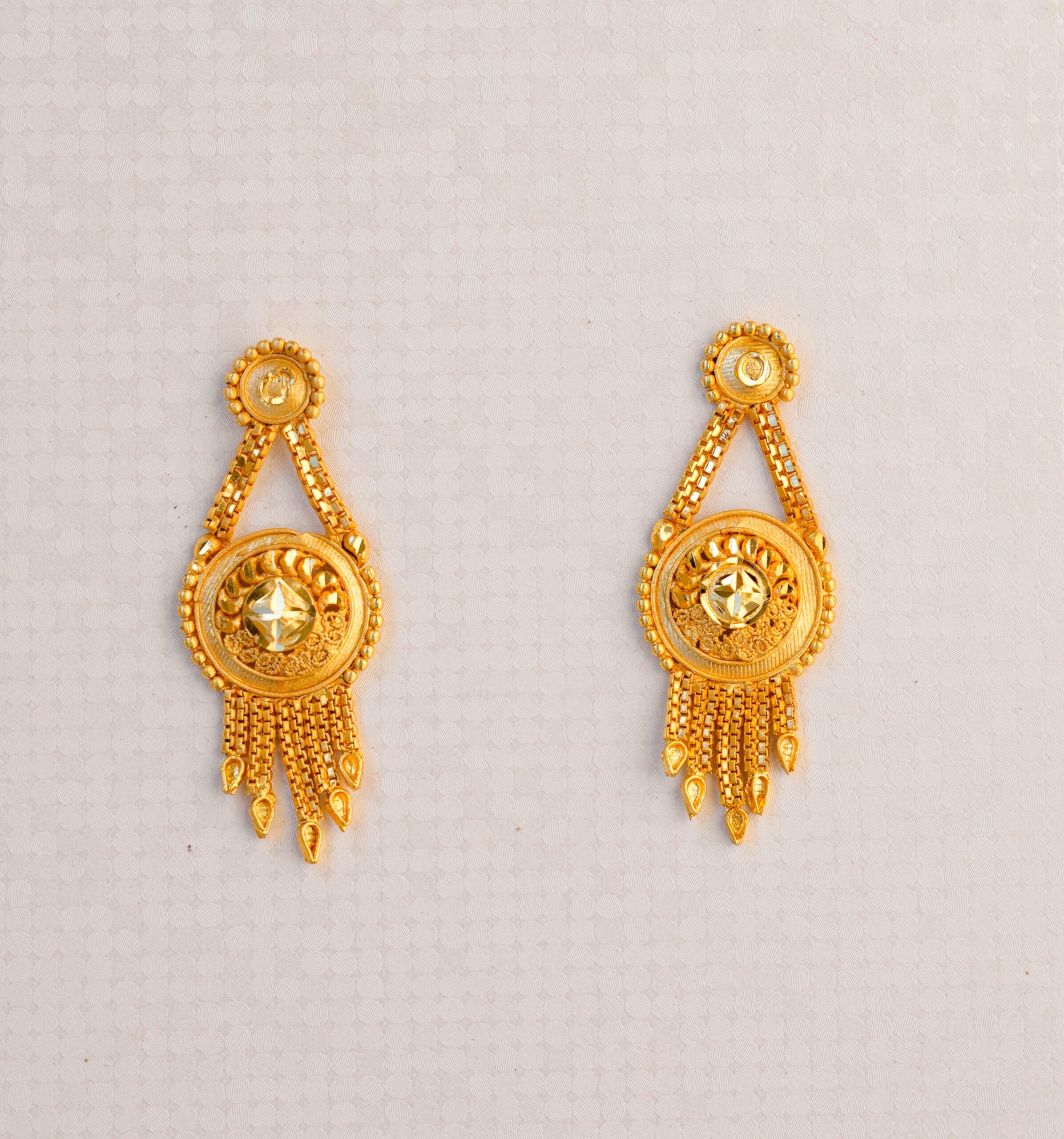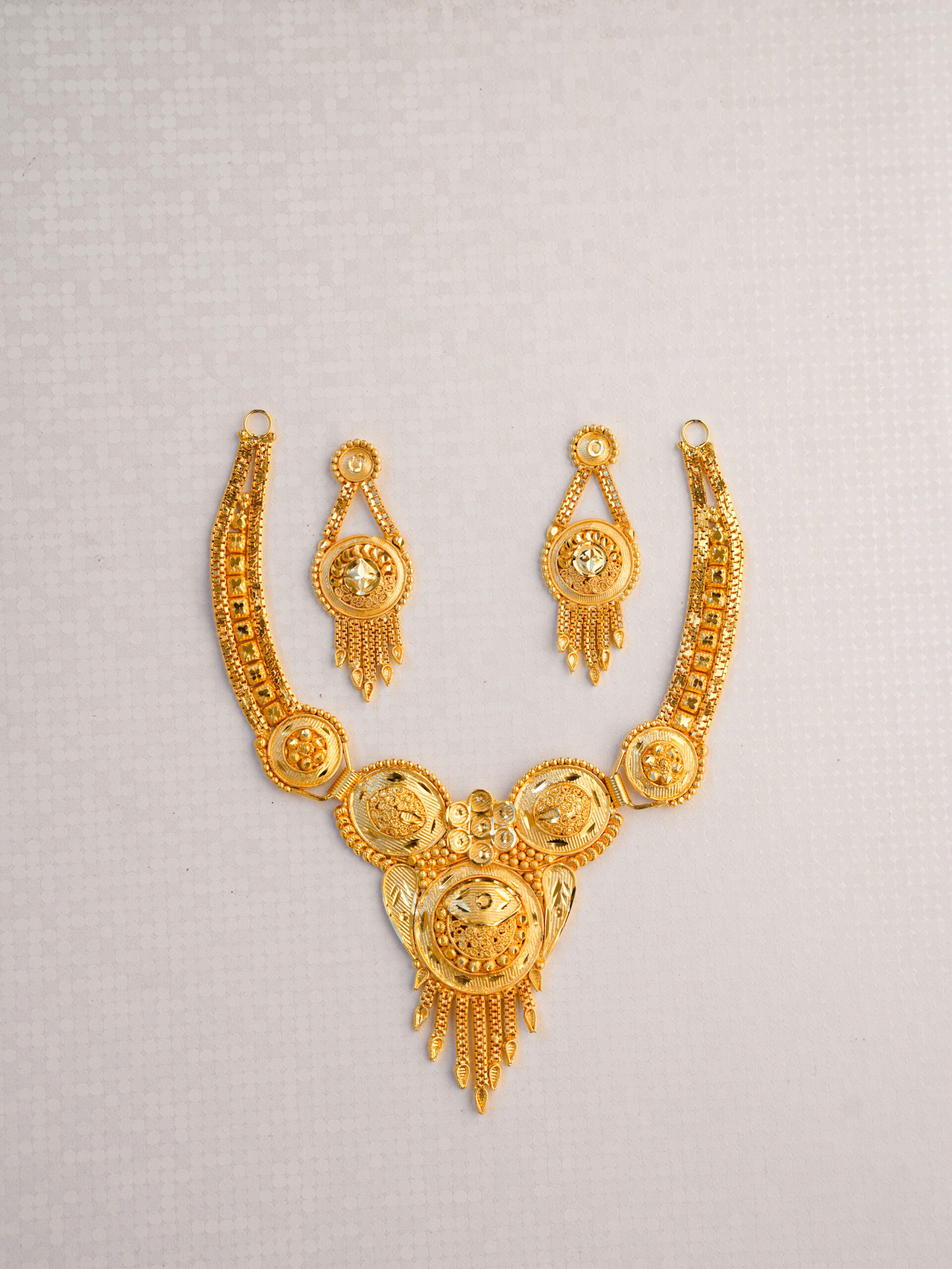 Earrings: Matching dangle earrings that echo the necklace’s centerpiece design. They feature a traditional circular top with delicate tiered drops, creating graceful movement.