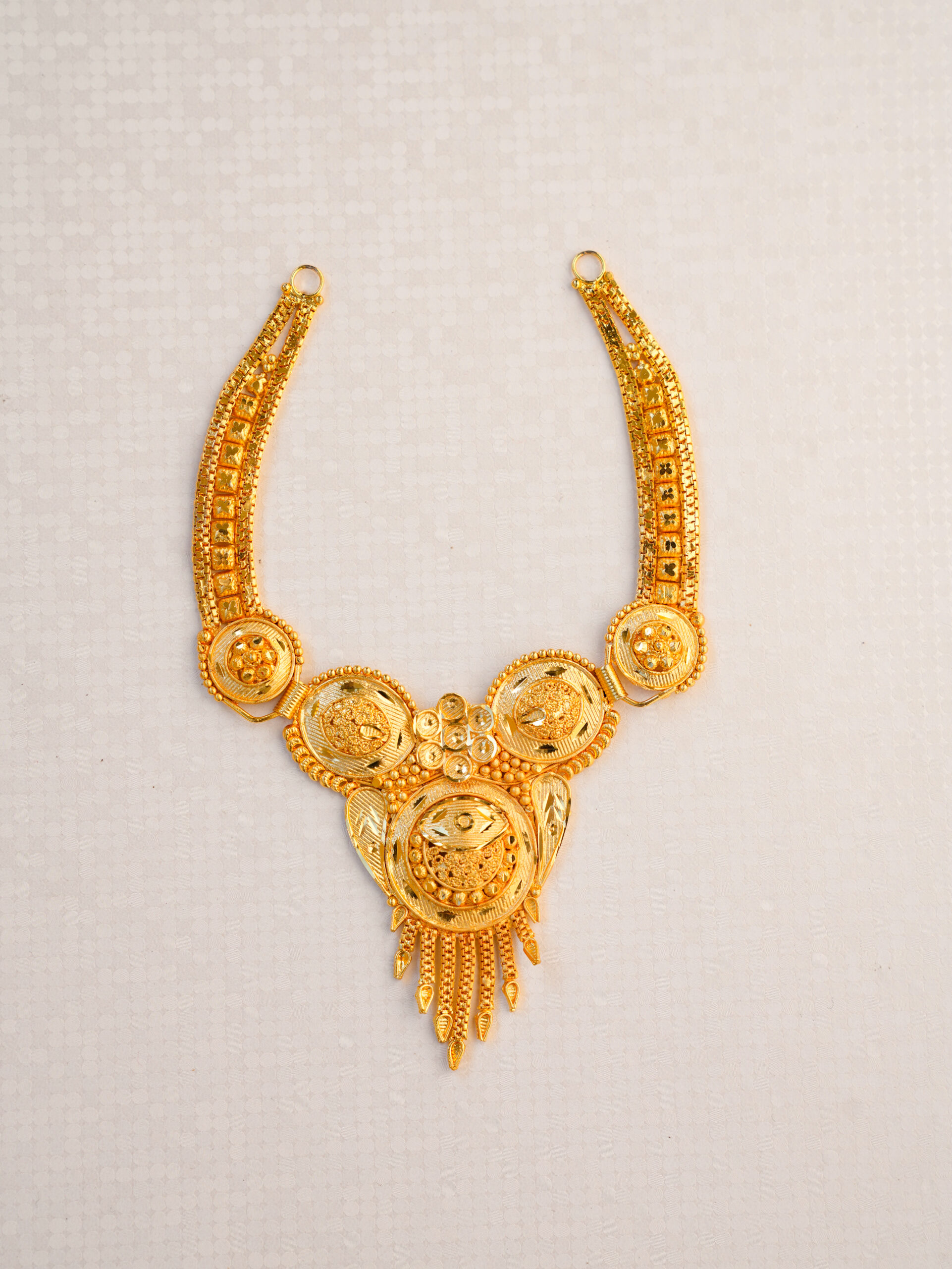 Design: Inspired by timeless heritage designs, the set showcases intricate filigree work and elaborate, layered medallions. The necklace’s central pendant features a prominent, detailed motif, framed by symmetrical links.